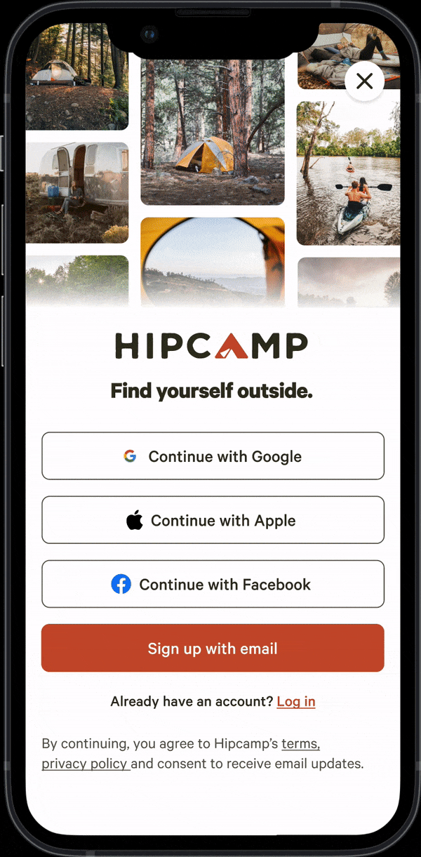 A redesigned app login screen to promote Hipcamp’s updated branding, various unique supply types, and single sign on options for simplying account creation.