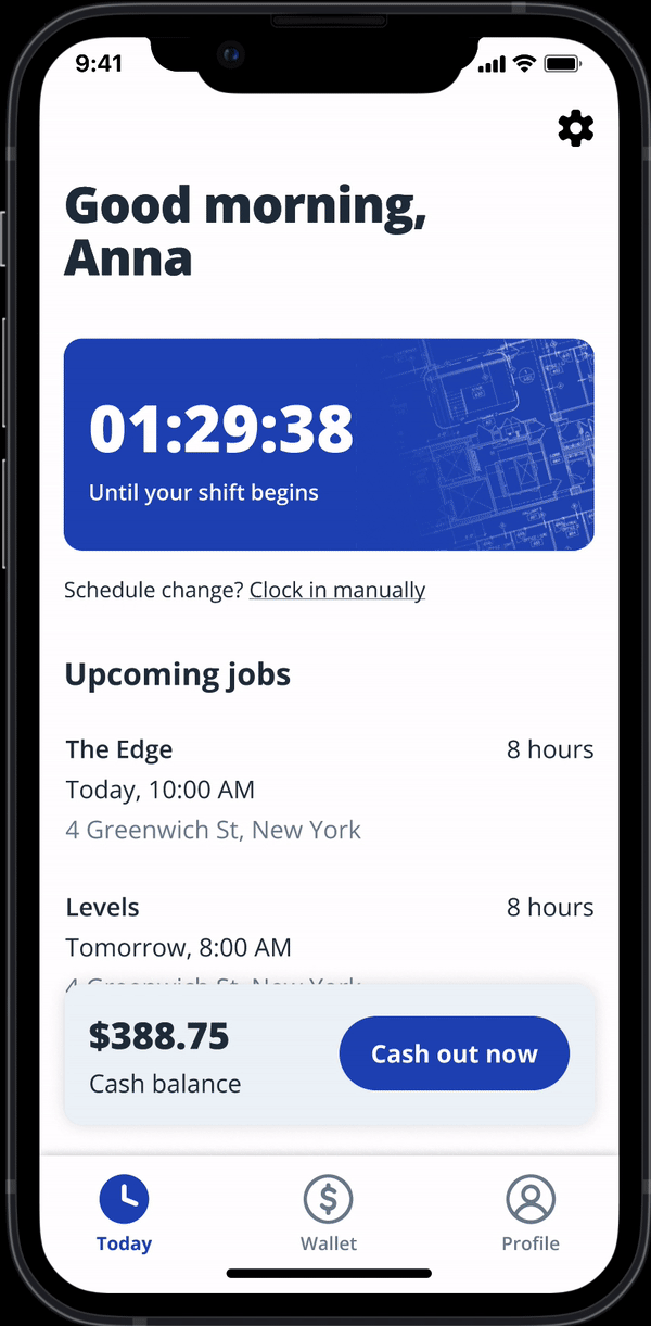 A snippet of my freelance work with Trayd, a time-tracking and money management tool for construction workers. This flow showcases the UX of clocking in and out of a job and immediately cashing out the money earned during that job.